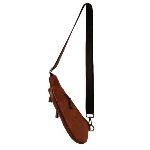 Genuine Leather Cross Body Bag with zippered compartments and fabric strap.